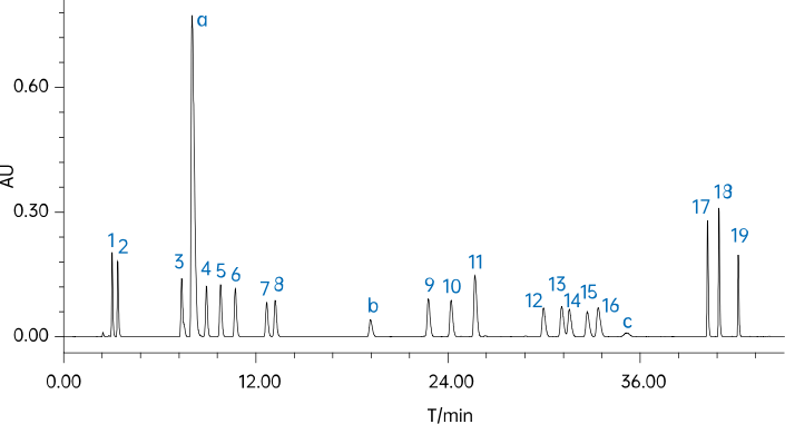 檢測物質:1.天門冬氨酸,2.谷氨酸,3.絲氨酸,4.精氨酸 ,5.甘氨酸,6.蘇氨酸,7.脯氨酸,8.丙氨酸,9.纈氨酸,10.甲硫氨酸,11.胱氨酸,12.異亮氨酸,13.亮氨酸,14.色氨酸 ,15.組氨酸,16.苯丙氨酸,17.半胱氨酸,18.賴氨酸,19.酪氨酸,a,b,c為衍生引入